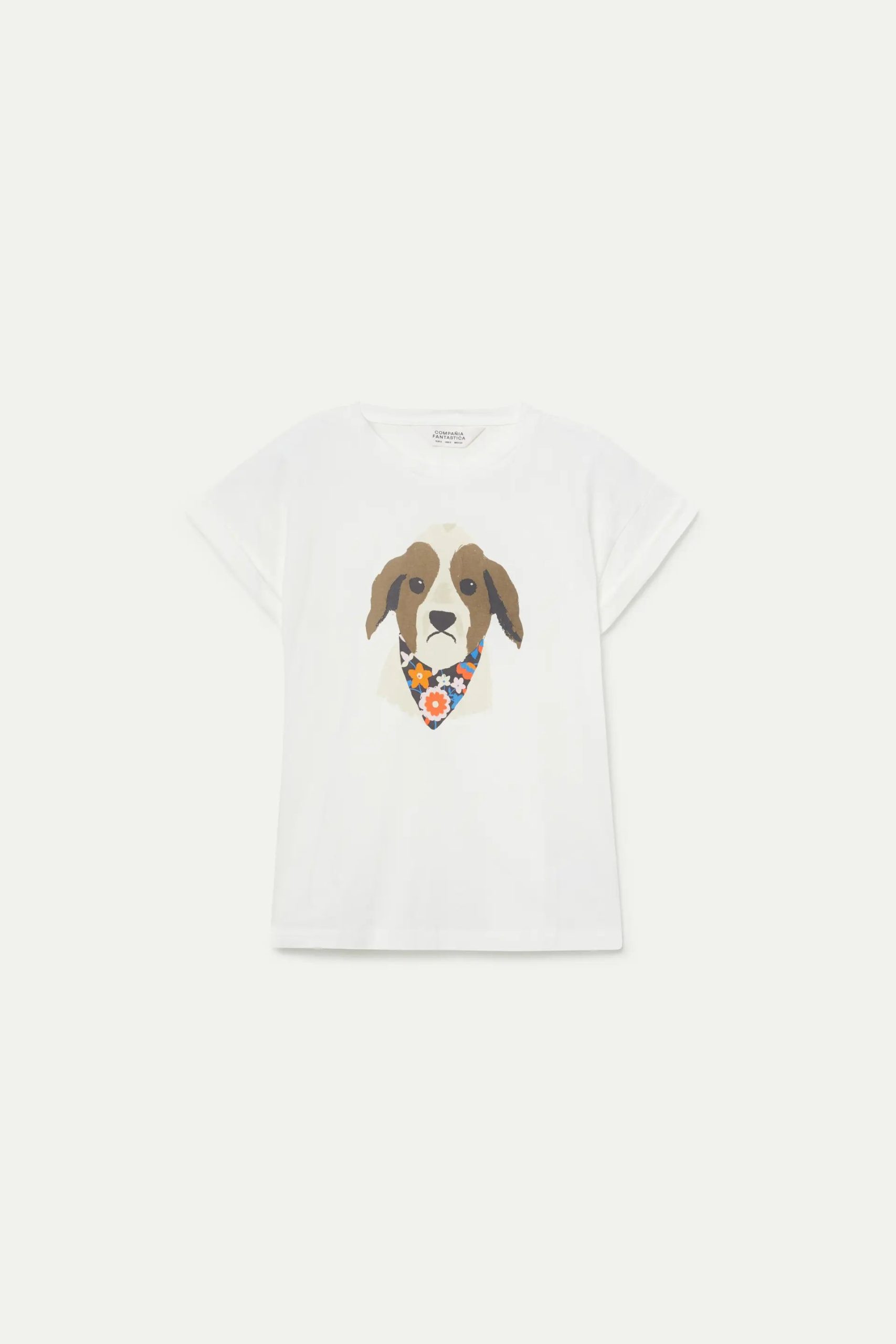 Camiseta de color blanco con estampado gráfico de perro con pañuelo con estampado floral. Con cuello redondo y manga corta. La modelo mide 175 cm y lleva la talla S.