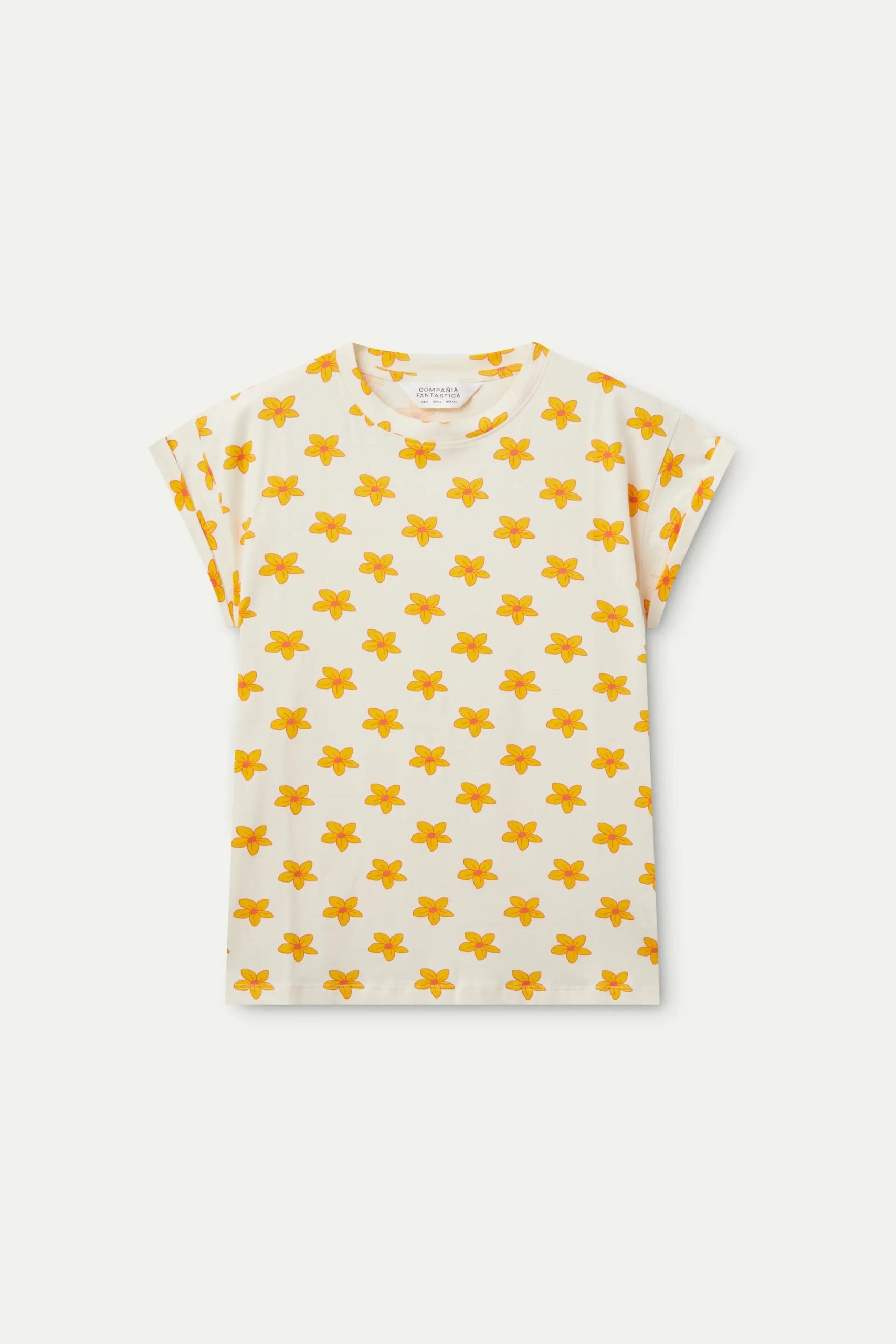 Camiseta en tejido circular de color crudo con estampado floral amarillo. Con cuello redondo y manga corta con vuelta.