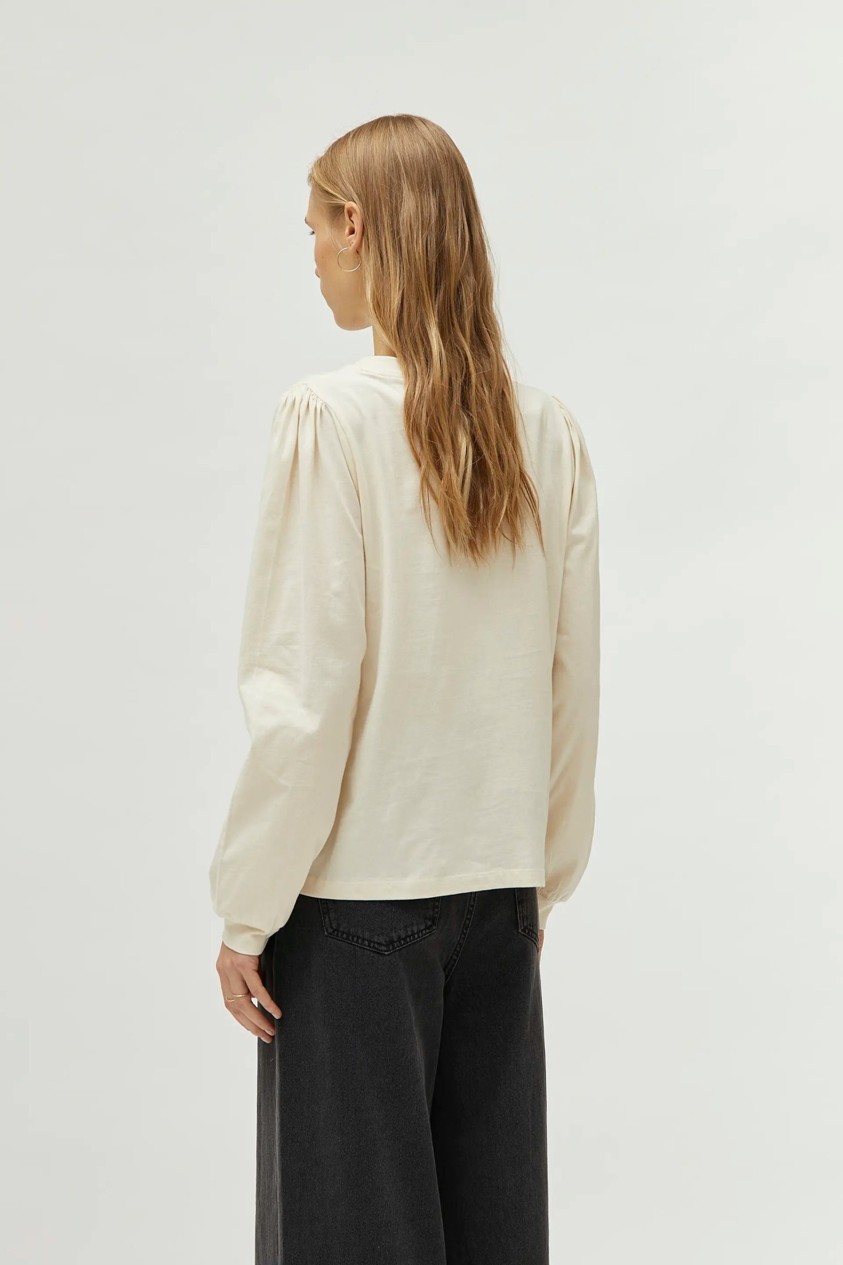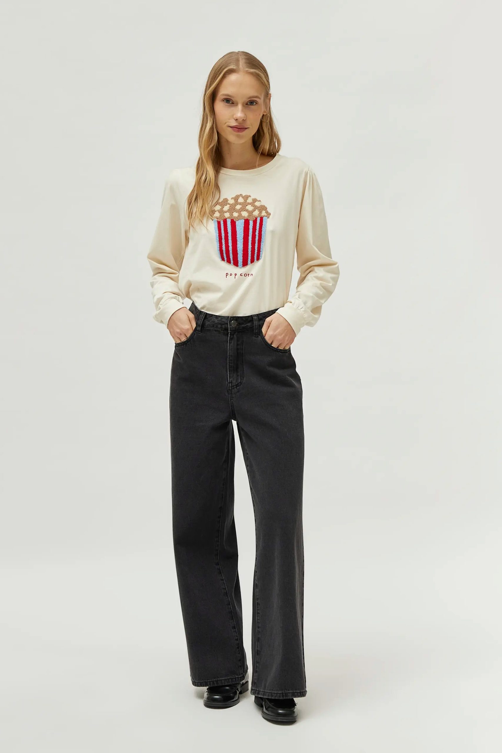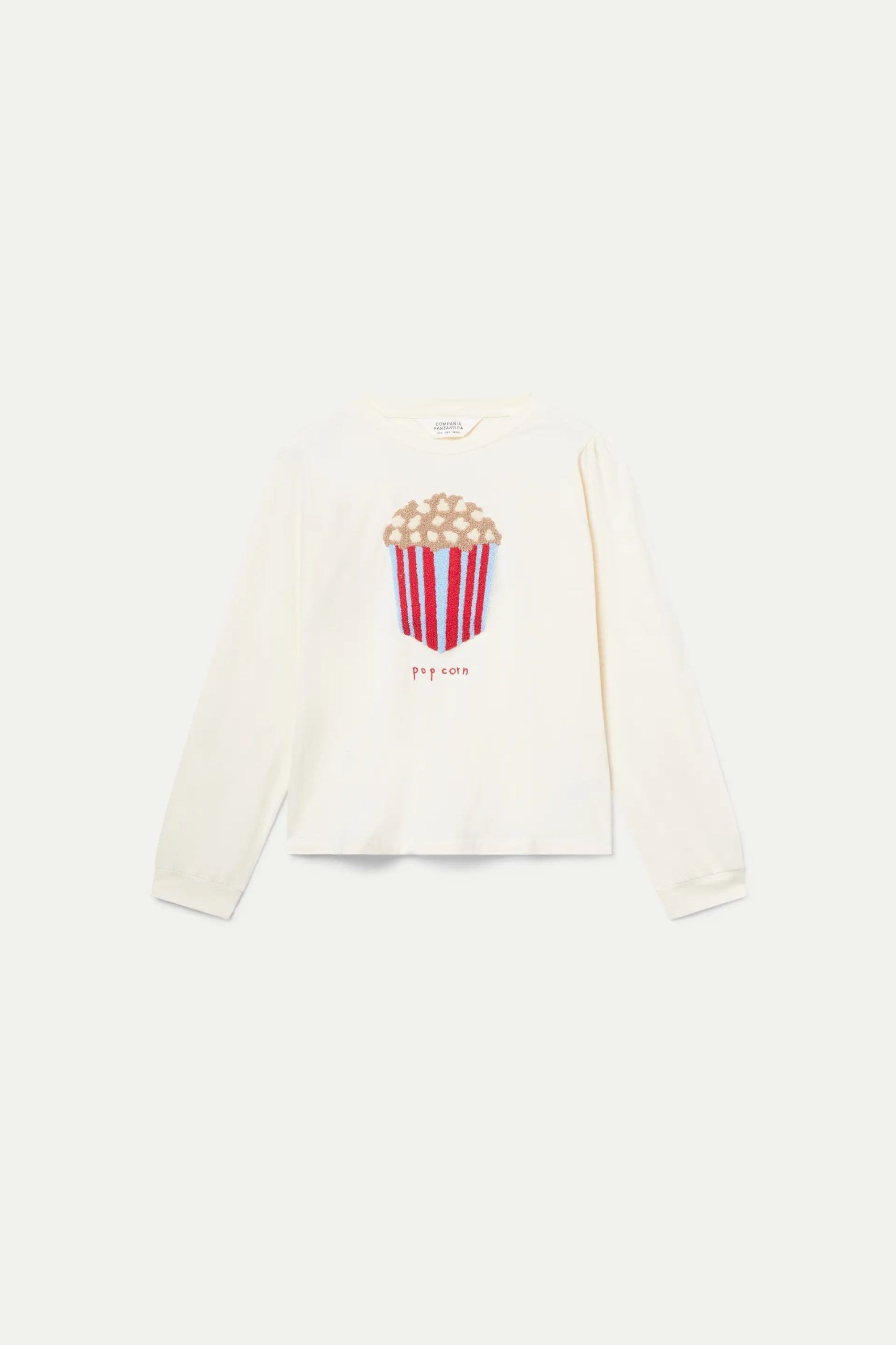 Camiseta de color crema con estampado gráfico de palomitas con textura. Con cuello redondo y manga larga acabada en puño elástico. La modelo mide 174 cm y lleva la talla S.