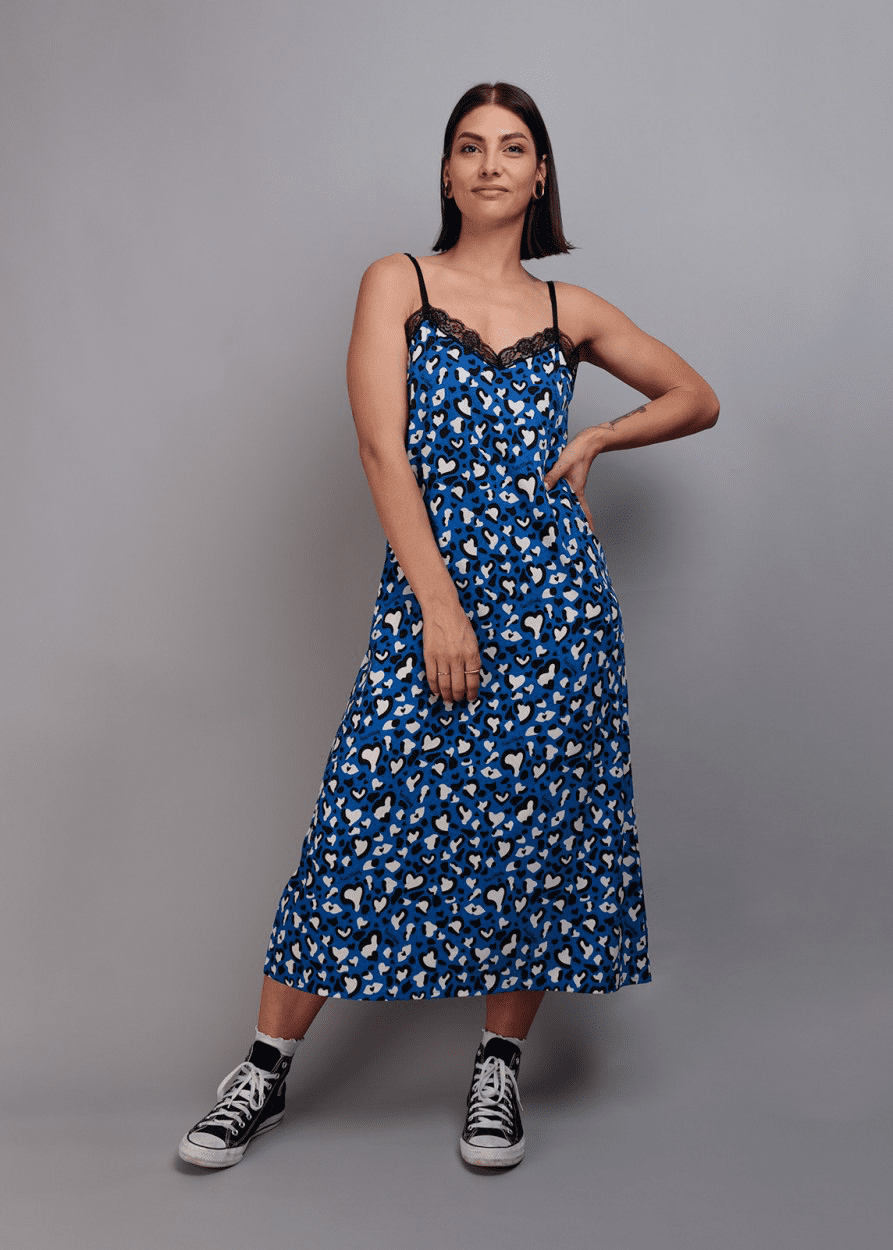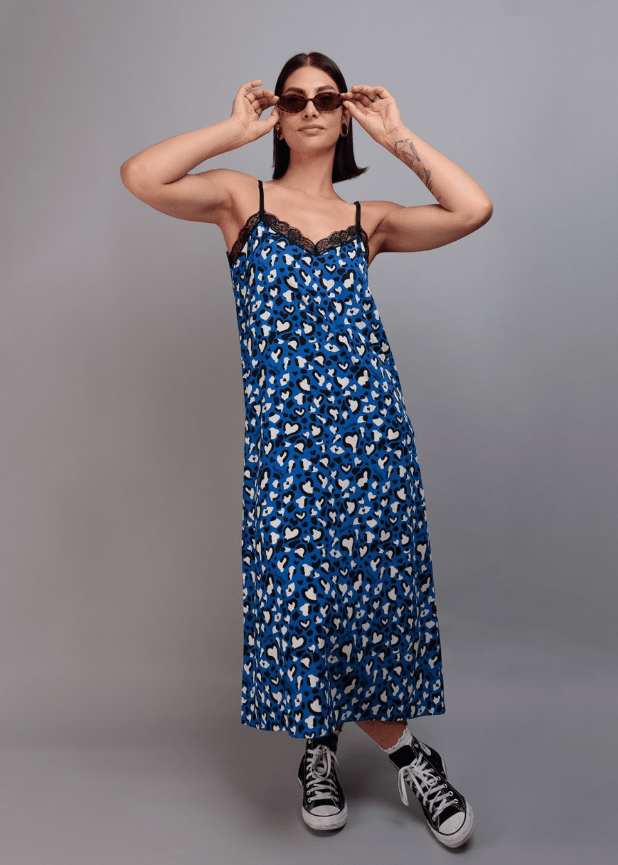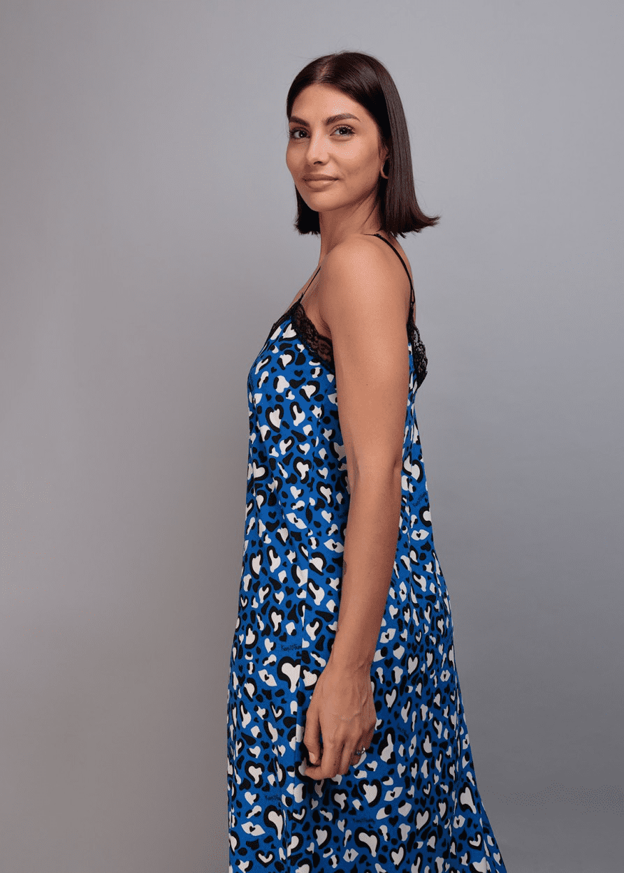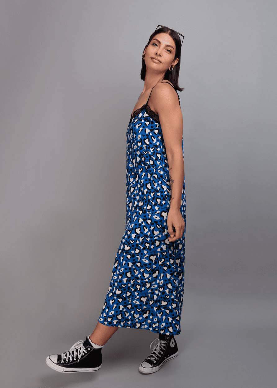 . Vestido lencero azul con estampado en tonos blancos y negros.